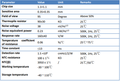 TTS-311 thermopile sensor is based on MEMS technology, consists of hundreds of thermocouples connected in series. Using Seebeck principle, when there is a temperature difference between the target and the environment, the sensor gives the corresponding voltage output, therefore detecting the existence of the target or the temperature of the target.